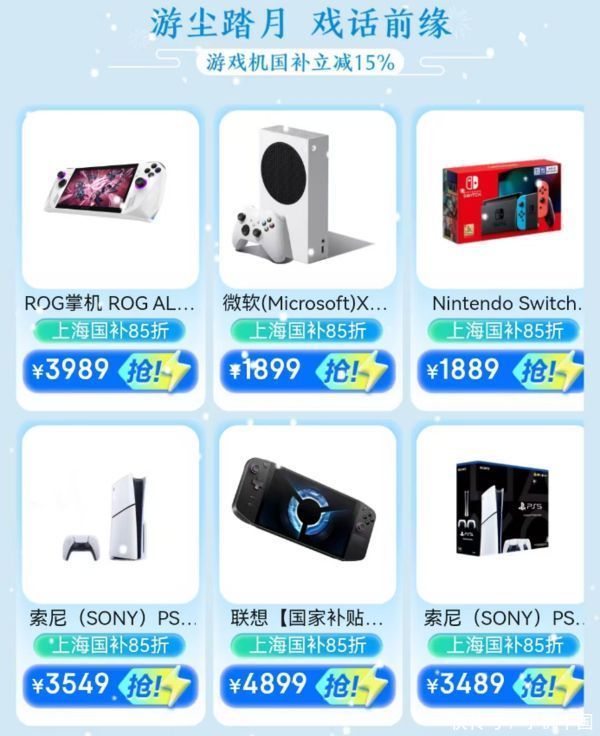 想要拥有精彩的游戏体验,高品质的游戏装备必不可少。无论是PS玩家、Switch玩家、掌机玩家抑或是Xbox爱好者,在京东都有合适的游戏设备可选,并且部分地区的用户还能使用国家补贴享受15%的价格优惠。例如ROG ALLY掌上游戏机,采用了AMD锐龙Z1E处理器,强劲性能支持下可畅玩各平台3A大作,上海用户可使用国家补贴立省15%,到手价3485元。活动会场还有索尼PS5光驱版国行主机、微软Xbox Series S游戏机、Nintendo Switch国行续航增强版游戏主机等众多游戏设备,上海用户均可使用国家补贴享85折优惠,进一步省钱。